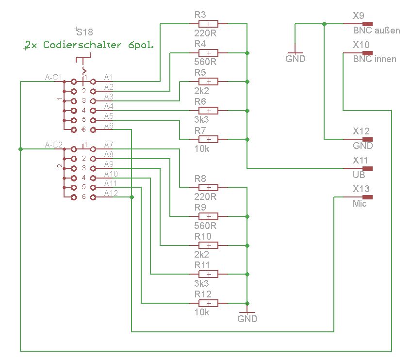 Um das ganze ein bisschen zu veranschaulichen hier ein Schaltplan. UB und GND werden extern angeschlossen (ca. 7,5V). Am BNC wird das Oszi angeschlossen um den Pegel messen zu können. Bei Elektretmikrofonen benötige ich einen Versorgungswiderstand der ebenfalls über einen Drehschalter versorgt wird.
