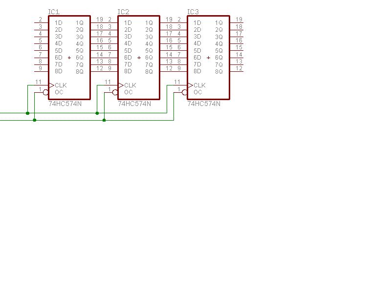 Hallo, Yagan: Ne soll kein Programmierer werden. Wenn ich jetzt wieder den Einsatzzweck schreibe werd ich nur wieder ausgelacht. Ich sag mal soviel. Es werden in regelmäßigen kurzen Abständen(µSek-mSek) Daten ausgelesen und die Leseadresse ändert sich in Abhängigkeit von Werten die aus dem A/D-Teil stammen. Dieses Analogteil habe ich auch schon fertig. Jetzt geht es um das Einlesen der Daten aus dem Speicher und danach mache ich die Sache mit den Ausgangssignalen. A.K.: Ich verstehe deine Schaltung nicht ganz, da ja hier alle 3 Bausteine über gemeinsame CK und OC-Leitungen angesteuert werden. Ich verstehe diese Bausteine so, das sie einen Wert weitergeben der intern gespeichert wird und das sie einen Wert vom Eingang direkt zum Ausgang weiterleiten können ohne das der interne Wert geändert wird. Und auserdem habe ich dann doch nur 8 bit und diese nacheinander ich muss aber z.b. die 12 Adressleitungen gleichzeitig ansteuern können, was ich mit Schieberegistern machen könnte was dann aber doch etwas lange dauert als wenn ich jeweils 8 bits an einen Latch schicke, danach die nächsten Daten an den nächsten Schicke.... und am Ende alle Latchs Output enable schalte.