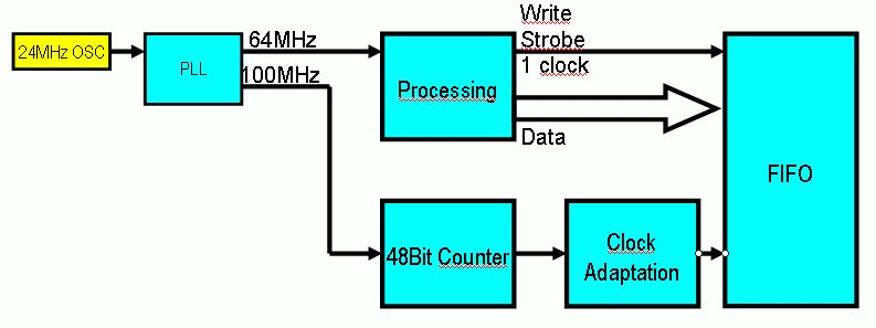 Hallo, hier eine Zeichnung meines Aufbaus. Der WriteStrobe ist 1 clock auf der 64MHz-Ebene lang. Und erst jetzt fällt mir noch ein weiteres Problem auf: Da der Counter auf 100MHz schneller zählt als die 64MHz-Ebene ist, kann natürlich auch die Setup-Zeit am Eingang des FIFO krass verletzt werden. Eine Lösung ist also zwingend nötig. Danke schon mal jetzt, Günter