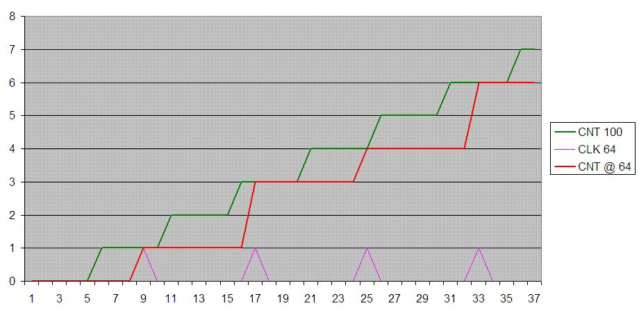 Klaus, Du hast im Prinzip schon Recht, aber man braucht natürlich noch das Stabilitätskriterium für den Bus. Also entweder doppelt parallel speichern und zweimal fragen, wie man es täte, wenn man auf die linke Domain keinen Entwicklungseinfluss hätte - gfs überabtasten, ein Strobe verwenden oder man generiert mit 64er Takt nur einen Wert, der dann genügend lange stabil ist. Ich hinterfrage aber nochmals den Sinn, einen Zeitstempel auf der falschen Seite zu generieren und dazu noch mit einer Domain, die gegen die Datendomain springt. Sinn macht es doch nur, die Domainen auf Datenebene synchron zu halten und nur auf Systemtaktebene die Sprünge zu veranstalten, sonst ja der Stempel keinen Wert. Sein Konzept ist schon faul. Wenn es aber dennoch so sein muss, rate ich weiter zu meiner Methode, die Zählerstände nach dem 25/16 Schema zu berechnen und rüberzutakten. Das ist das Genaueste. Deine FIFO-Lösung hat den Nachteil einer vergrößerten dynamischen Latenz. Je nachdem, wie die Taktflanken liegen, kann vom Übergang von einem auf einen anderen 64er Takt ein Sprung mal früher (also VOR dem 25/16 Masstab) als auch danach ausgelöst werden. Daher springt der Zähler im Extremfall mit +/10ns + den eigenlichen Versatz, der bei +/-100/64 ns liegt.