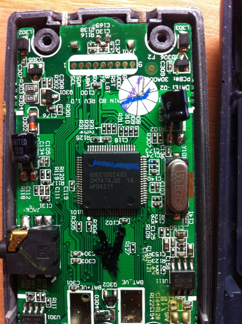 Hallo Leute, ich habe heute ein Tchibo Handset auseinandergebaut,da die alten DECT Telefone nicht mehr benötigt werden, die Akkus schwach sind und ich sie sonst einfach wegwerfen würde. Ich war sehr erstaunt, dass die Platine relativ gut beschriftet ist. Man erkennt einen (Service)-Anschluss über den man anscheinend alle (mehr oder weniger) wichtigen Signale abgreifen kann. Leider ist es mir nach einer Stunde suche nicht gelungen herauszubekommen, um welchen Prozessor es sich handelt. Ich möchte hier daher ein Foto hochladen. Vielleicht kennt der ein oder andere das Derivat ja. Falls es jemand auf dem Bild nicht lesen kann, auf dem Prozessor (zumindest halte ich das Bauteil für diesen) steht folgendes: 60EC1002465 CM74 74.00 14 kPO4211 Ich denke das kPO4211 ist irgendeine Datumsangabe oder eine Produktionsnummer. Genauso ist die 14 in der zweiten Zeile anscheinend eine laufende Nummer. Ich weis das weil ich zwei dieser Handsets habe und eben an diesen besagten Stellen unterschieldiche Bezeichnungen zufinden sind. Vielleicht könnt ihr mir ja weiterhelfen. MfG BlueMorph