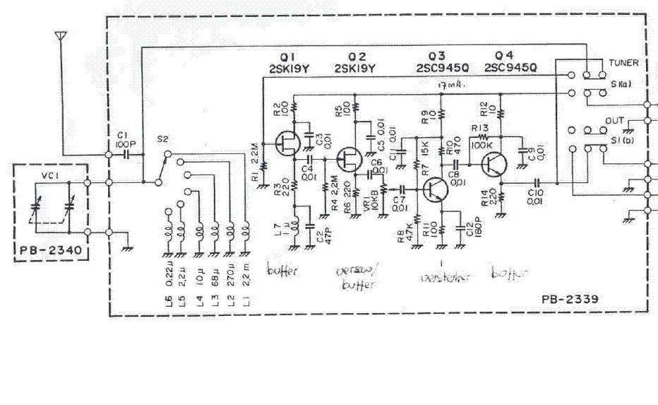 Die (gute) alte FRA-7700. :-) Ich hab die mal mit BF245 und BC550C nachgebaut - funktioniert einwandfrei. 2SK19Y = BF244, BF245, BF346, 2N3822, 2N3823 2SC945Q = BC107, BC171, BC183, BC207, BC237, BC382, BC547, BC582, 2N2220, 2N2222 Bei allen Vergleichstypen die Pinbelegung beachten!