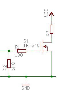 Halte ich für keine gute Idee. Der BUZ71 ist ein "normeler" MosFet, der um die 8 Volt Spannung zwischen Gate und Source zum vollständigen Öffnen braucht - das kann der Mikrocontroller bei einer Betriebsspannung von 5 VOlt nicht liefern. Ein Logic-Level-Typ wäre da klar die bessere Wahl, der macht auch schon bei 3-4 Volt komplett auf. Wie ds geht? Siehe Bild im Anhang. Der Gate-Vorwiderstand unterdrückt Schwingneigungen, die 6,8 Kiloohm nac Masse sind ein Entladewiderstand, damit der FET auch wieder "zugeht". R3 ist die Last, der Verbraucher - was auch immer das sein mag. Die Betriebsspannung VCC ist in diesem Falle unabhängig von den 5V des Prozessors und richten sich nach dem Verbraucher und nach dem FET. Der als Beispiel eingezeichnete IRF530 ist übrigens auch kein Logic-Level-Typ. Gruß: Holger