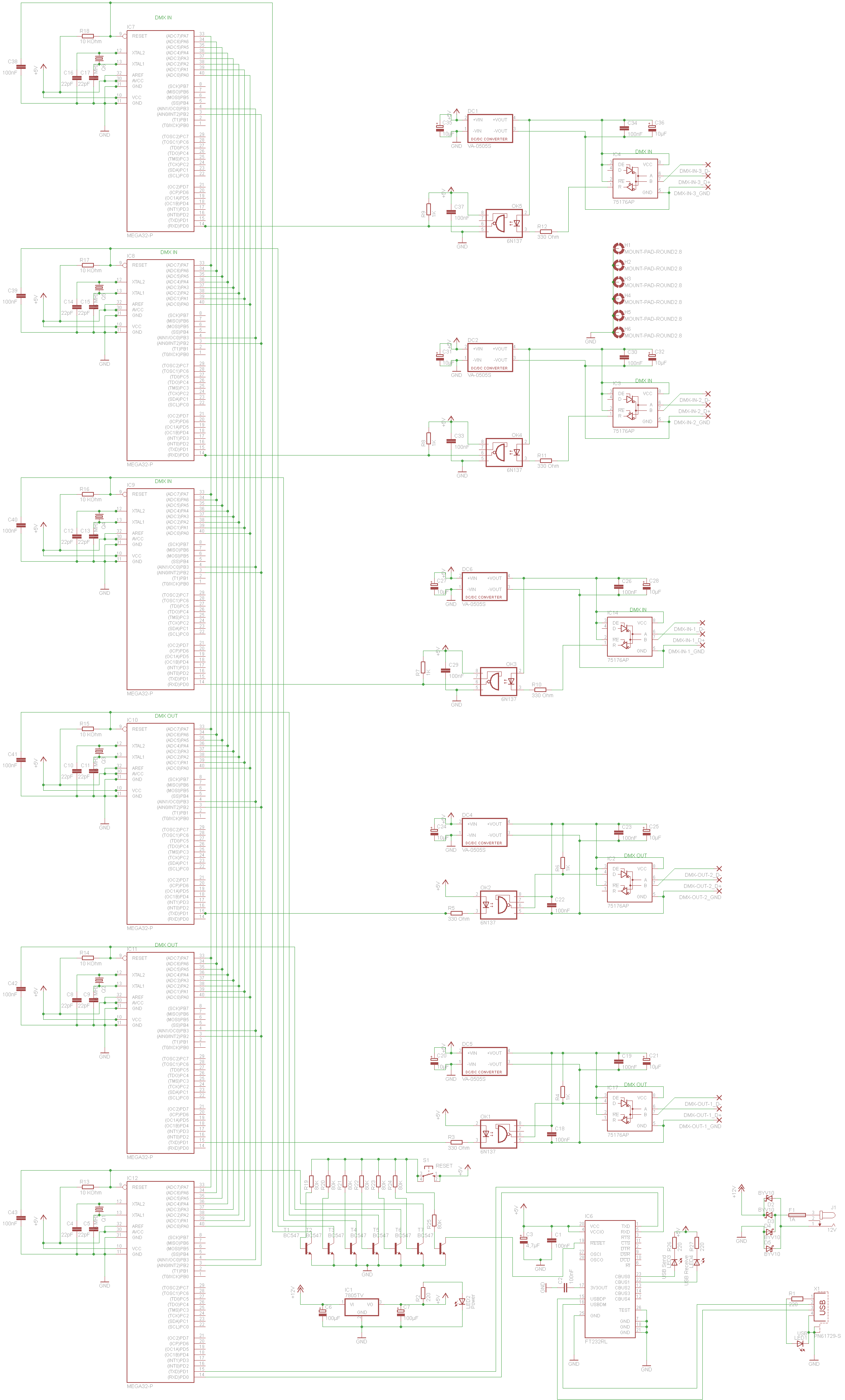 Hallo und einen schönen sonnigen Montag wünsch ich euch Nach längerem Überlegen habe ich mich dafür entschieden als Hauptprozessoren auf Atmega32 zu setzen, da diese Einfach aufzulöten sind und auch Die Leitung haben damt ich Einfach Mit ihnen Arbeiten kann. Es hat sich inzwischen ergeben, dass ich auf 3 DMX Eingänge und 2 Ausgänge umgestiegen bin. Als USB Chip Möchte ich einen FT232R benutzen. Einge Galvanische Trennung habe ich auch verbaut. Ich habe einen Schaltplan erstellt und wollte nun fragen Ob irgendwer noch Fehler entdeckt. Ich mache Sowas zum ersten Mal und Hoffe deswegen auf eure Hilfe. Hoffe der Schaltplan ist nicht zu groß geworden. Die vielen Leitungen unter den Chips sollen zur einfachen Komunikation genutzt werden. Viele Grüße und eine schöne (hoffentlich sonnige) Woche wünsch ich euch David