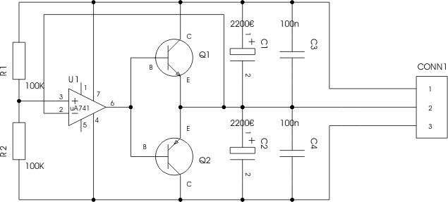 OT: Als reiner Hobbyist (und dazu noch Anfänger) habe ich nicht den Überblick über den deutschen Elektrotechnik-Arbeitsmarkt, aber wenn es sich hier ähnlich verhält, wie im IT-Bereich, wo ich zwei Jahrzehnte Berufserfahrung habe, gibt es wohl tatsächlich eine Menge Spreu im Weizen. Nur würde ich das nicht an Postings in diesem Forum festmachen wollen, auch wenn der Gedanke nahe liegt. Wir haben in Deutschland viele fähige Leute, die sich über den Rahmen ihrer professionellen Ausbildung hinaus in einer Tiefe mit ihrem Thema beschäftigen, wie es in anderer kultureller Umgebung nicht so häufig zu finden ist. Dies wird leider überschattet durch ganze Armeen von Hochschulabsolventen, die ihren Abschluss durch reines Pauken erreicht haben, mit Ehrgeiz als Antrieb, ohne die Liebe zum Thema. Aber zum Glück gibt es fähige Leute wie MaWin, die hier einen Kontrastpunkt bieten. Wenn hier zu einer Frage verschiedene Antworten kommen, liegt das meines Empfindens nach auch an unpräzise gestellten Fragen. Der Punkt ist, dass daraus gerne Konflikte zwischen Antwortenden entstehen, ohne das diesen der Ursprung des Konflikts, nämlich die Ambiguität der Frage auffällt und jeder die Antwort des anderen auf seine Interpretation der Frage bezieht, was sie in seinen Augen unqualifiziert erscheinen lässt. Zum Thema: Ob man ein Signal mit wechselnder Polarität mit einem Spannungsteiler in einen bestimmten (positiven) Bereich ziehen kann, hängt meines Verständnisses nach davon ab, ob die Impedanz der Signalquelle und des Eingangs des Messverstärkers das zulassen. Wenn die Signalquelle hochohmig ist, wird ein Spannungsteiler nicht nur das Messergebnis beeinflussen, sondern auch den zu messenden Wert selbst. Dann muss ein Impedanzwandler dazwischen geschaltet werden, und der wiederum braucht eine Versorgungsspannung, die mindestens dem Bereich des Eingangssignals (gegenüber dem gemeinsamen Bezugspunkt) entspricht. Wenn hingegen die Signalquelle niederohmig ist, wie z.B. die Sekundärwicklung eines Netzteil-Trafos, kann man natürlich das Signal mit einem Spannungsteiler in den positiven Bereich ziehen und dann auswerten. Ich habe gerade gestern ein kleines Modul für mein Steckboard gebaut, um eine symmetrische Spannungsversorgung zum Spielen zu haben. Ein Spannungsteiler halbiert die Eingansspannung, ein OP (uA741) füttert damit eine Gegentakt-Endstufe (BD139/BD140) deren Ausgang an den "-"-Eingang des OPs gegengekoppelt wird, um die Schaltung als Impedanzwandler zu betreiben. Der Ausgang der Endstufe ist dann auch das neue GND-Potential. (Ich denke mal, das ist das, was kolisson mit virtuellem Offset meinte.) (Siehe Anlage) Nachtrag: Die Elkos sind nicht so teuer. :D das soll eigentlich ein Mü sein, dein Euro.