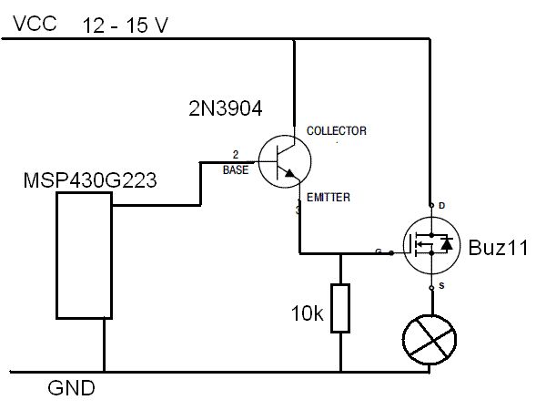 Hallo Zusammen. Ich habe folgendes Problem. Ich möchte mit meinem Mikrocontroller MSP430G2331 Pulsweitenmodulation betreiben. Software ist kein Problem. Der Ausgang schaltet wunderbar zwischen 0 und 5 V hin und her. Allerdings wenn ich die Steuerleitung direkt vom Mikrocontroller direkt an das Gate des Buz11 hänge, schaltet der Buz11 nicht. Kann es sein das die Gatespannung mit 5 V zu niedrig ist? Ich habe mir jetzt eine Schaltung überlegt, mit der es funkionieren könnte. Siehe Bildanhang. Allerdings funktioniert es nicht. Die Spannung an meinem 2N3904 Transistor bricht immer so weit ein und der Buz 11 schaltet immer noch nicht. Ich habe auch schon einen vorwiederstand zwischen Gate von Buz und Emitter vom 2N3904. Ohne Erfolg. Ich verstehe das nicht mehr. Ich habe so eine Schaltung schon einmal mit einem NE555 Timer aufgebaut und der konnte den Buz ohne Probleme schalten. Ich wäre für Ratschläge sehr dankbar.