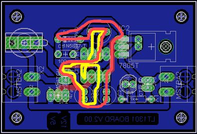 Warum nimmst du die Kupferfläche nicht als Masse? Such mal deine Stromkreise: http://www.lothar-miller.de/s9y/categories/40-Layout-Schaltregler Ich habe dir das mal eingezeichnet, sieh dir das an. Da kann nicht gut sein! Der Ausgang eines Schaltreglers ist immer der Ausgangskondensator, der Eingang der Eingangskondensator. Nicht umsonst ist das in den Übersichtsplänen immer so gezeichnet.