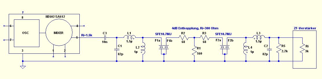 Hallo Kurt >finde bei Reichelt nur 10,240-MHz-Quarze. Da die Keramikfilter ziemlich breitbandig sind, geht das auch mit einem 10,240 MHz Quarz. Die 1. ZF liegt dann bei 10,695 MHz. Das befindet sich immer noch fast in der Mitte des Durchlassbereiches. Dann würde ich aber auch gleich andere Keramikfilter nehmen, und zwar SFE 10,7 M3 mit einer Bandbreite von "nur" 180 KHz bei 3dB. Von diesen dann zwei hintereinander kaskadieren. >der gewählte Empfangsbereich von 2,3MHz bis 15,5MHz Ist Dir klar, daß sich dann Deine ZF mitten im Epfangsbereich befindet? Der SA602 dämpft zwar die Eingangsfrequenz um ca. 35dB und falls die Loopantenne nicht auf 10,7 abgestimmt ist, dampft diese um weitere 20dB. Falls trotzdem die ZF durchschlägt, wird zwischen der Antenne und dem SA602 ein 10,7 MHz Sperrfilter notwendig. Es sollte sich jedenfalls zwischen 10,5 und 10,9 MHz kein starker Sender befinden. Gruß, Bernd