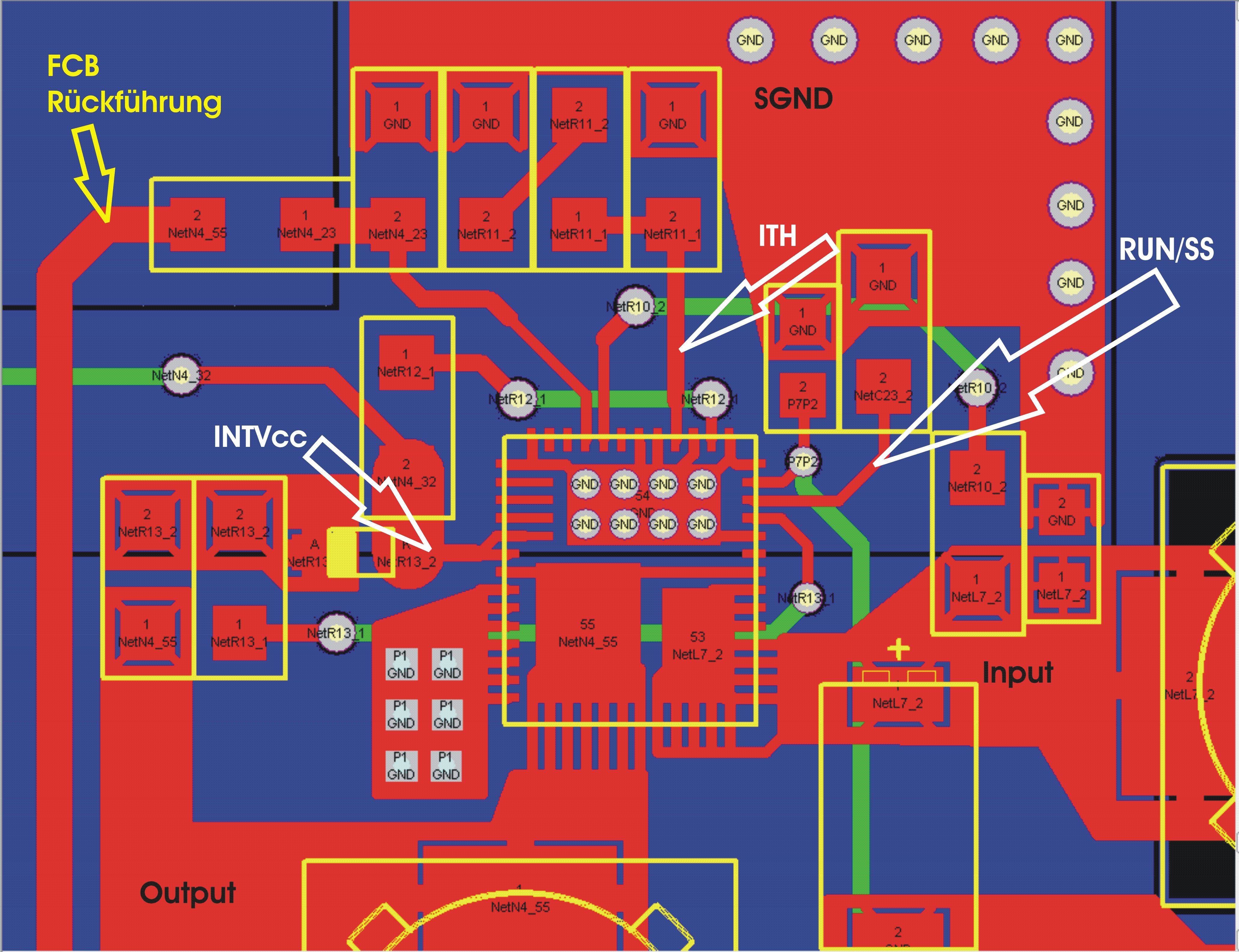 Moin Leute, die ST1S14 Probleme sind gelöst, nach dem ich die Platine hier hatte und bestückt habe, war die Strombegrenzung auf 0.5mA Geschichte. Danke noch einmal an alle die mir geholfen haben, vorallem an Lothar Miller! Mit dem richtigen Layout lässt sich doch einiges optimieren :) Tja und weil das ganze so erfolgreich war, dachte ich ich versuche mich gleich mal an etwas mehr oder weniger komplizierteren: Ich habe nun auf die Platine noch einen LTC3609 verbaut http://www.linear.com/product/LTC3609. Den Stromlaufplan und das Layout habe ich angehängt. Ich möchte 4V/ca.5A damit "treiben". Vorweg: Es ist mir echt schwer gefallen diesen Chip "schön" zu verdrahten, dafür liegen einfach zu viele Pins total ungünstig... Im Einschaltmoment sind ganz kurz die gewünschten 4V am Ausgang. Danach sackt Vout auf ca. 1.8V ab, nach einer Zeit steigt die Ausgangsspannung wieder auf max. 2.4V. Die wichtigsten Spannung sind alle wie im Datenblatt beschrieben vorhanden: -Ith=2.3V -INTVcc=5V -RUN/SS=3.6V -SVIn=24V, diese Verdrahtung ist im Layout nicht zu sehen, hatte ich vergessen und habe ich nun mit der Hand gelegt. -EXTVCC=hatte ich auch vergessen zu verdrahten, liegt jetzt auf GND, bringt aber leider keine Veränderung. Die Frage ist hier auch: Wenn ich 4V und ca. 6A treiben will, ob es langt wenn ich EXTVcc auf GND lege oder hier doch besser externe 5V anlegen sollte (was ich nicht möchte)?! -Von=GND -FCB=GND (continuous synchronous operation) [wäre nett wenn mir jemand die Funktion dieses Pins nochmal erklären könnte!] -Ion=160k->0.8V Der Chip scheint also ersteinmal eingeschaltet und am arbeiten zu sein... Fällt jemandem dazu was ein? Wäre genial wenn ihr mir nochmal helfen würdet. Falls weitere Infos benötig werden, werde ich alles liefern :) MfG jey