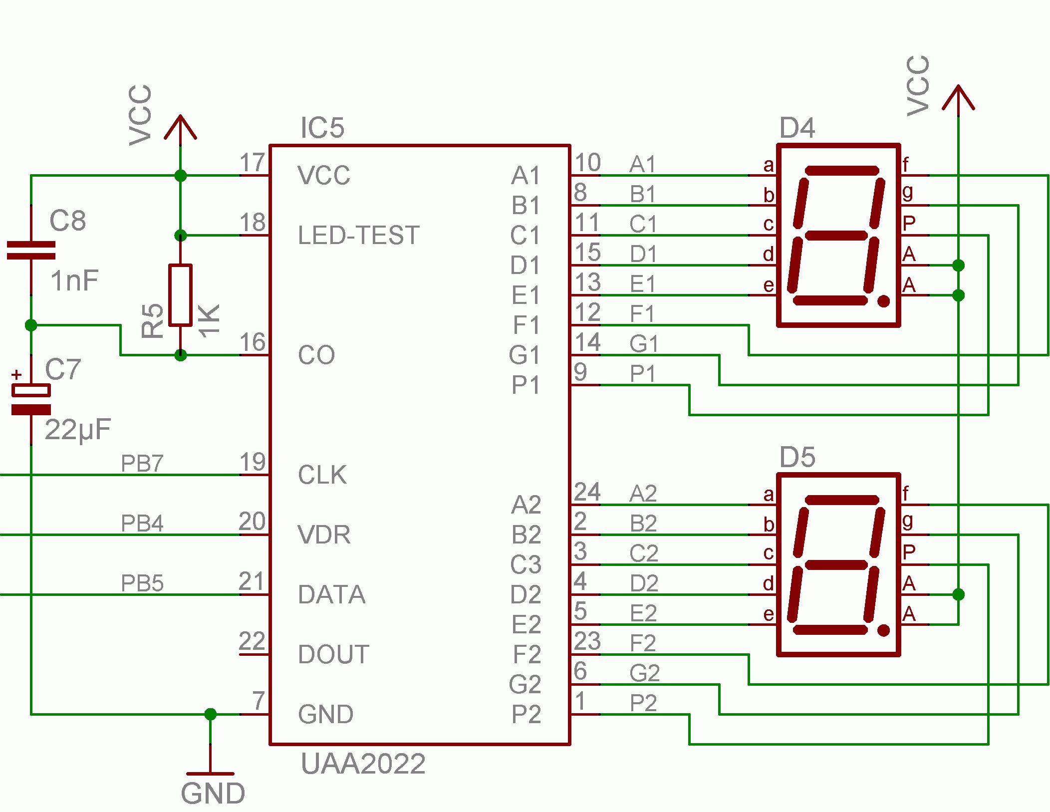 Hab auch kein Datenblatt gefunden. Dennoch konnte ich mit einigem Probieren das erfolgreich zum Laufen bringen. Hab das Projekt mittlerweile schon etwas aus den Augen verloren. Soweit ich aber weiß hat das Teil ein 16-Bit Schieberegister. Meine Initialisierung ging so: SPCR = (1<<SPE)|(1<<MSTR)|(1<<CPOL)|(1<<CPHA)|(1<<SPR0); // Master bei 250KHz (F_CPU/16) und benutze es dann so: SPDR = pos[0]; // Position 0 (LSB) while ((SPSR & (1<<SPIF)) == 0); SPDR = pos[1]; // Position 1 while ((SPSR & (1<<SPIF)) == 0); PORTB |= 0x10; // Übernahme-impuls für UAA2022 PORTB = PORTB; // 2 Takte Delay PORTB &= ~0x10; Mit diesen Zeilen funktionierte es bei mir. SPI-Takt nicht zu hoch setzen!