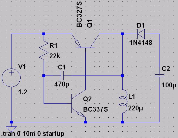Harald schrieb: ..... >> Poste bitte die Schaltung mit konkreten Werten. .... > Keine Schaltung, Dieter? Macht nichts. Habe mir schon gedacht, dass du > ein Blender bist. Wie Christian verwendete ich eine gescheite Spule mit Ferritkern, Das war eine Ringkern mit zwei gleichen Wicklungen (1mH, 1Ohm, Imax 20mA primär). Zu beachten wäre noch, dass die Transistoren (BC npn, für negative Spannung pnp) so gewählt werden, dass die Sättigungsspannung Collektor-Emitter unter 0,1V liegt. Mit einer Luftspule einen Wirkungsgrad von 70% zu erreichen bezweifelt Harald und ist auch zutreffend. Und da komme ich gleich auf den ersten Haken an Schaltung für Spannungen größer als 5V, bzw. -5V. Während des FlyBack (Entladungsstoß der Spule) erreichte die Spannung an der Basis die Durchbruchspannung der Basis-Emitter-Strecke. Beholfen habe ich mich für höhere Spannungen indem das Übersetzungsverhältnis geändert wurde auf eine Untersetzung von 1:2. Wesentlich mehr ändern konnte ich dies nicht, da sonst die Schaltung nicht mehr so zuverlässig kippte. Als andere Methode überbrückte ich Basis-Emitter mit einer Diode und LED um die Sperrspannung zu begrenzen. Diese Belastung reduzierte allerdings den Wirkungsgrad merklich. Mit QUCS simulierte ich die Schaltungsvarianten und die Ergebnisse deckten sich mit meinen Beobachtungen. Allerdings für den Fall, dass Du nur Spulen mit einer Wicklung haben solltest gibt es folgende Schaltung: http://www.b-kainka.de/bastel36.htm Du müßtest diese Schaltung statt mit npn mit pnp Transistoren aufbauen. Den linken Transistor kann man auch für die Abschaltung verwenden, wenn die maximale Ausgangsspannung erreicht wurde.