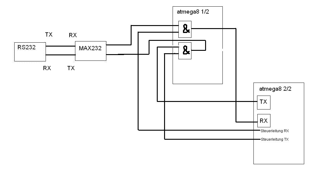 Hallo, wie Ihr im angehängtem Bild sehen könnt möchte ich mit einem zweiten Atmega8 die UART Leitungen schalten um später mehrere UART-Geräte an dem UART-Port vom Atmega8 2/2 anzuschließen, sodass immer "gesteuert" ein Gerät verbunden werden kann. Ich habe bereits über folgende Möglichkeiten gelesen: separater UART Multiplexer Baustein Logik Gatter Controller mit mehreren UARTS Selbstbau Dioden UND-Gatter trotzdem würde ich es gerne so machen wie auf dem Bild gezeigt. Diese Variante wäre dann auch einfach erweiterbar. Aufgebaut habe ich es bereits. Beide Atmegas funktonionieren unabhängig voneinander einwandfrei. Der UART Atmega (läuft 16 MHz) sendet und empfängt über das Terminalprogramm. Der Logik Atmega (läuft mit 4Hhz) reagiert mit der UND-Logik wenn man VCC auf die Eingänge gibt. Aber im Verbund klappt es nicht. Meine Fragen: 1. Kann das überhaupt funktionieren, wenn ja wie? 2. Muss ich vielleicht mit Transistoren arbeiten? 3. Müssen alle unbenutzten Pins vom einem Port vorsichtshalber auf Masse gelegt werden?