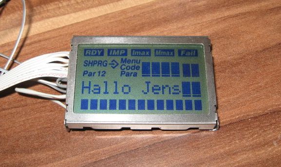 Ich habe da mal ein P192A von Data Vision analysiert und die Pinouts und Ansteuerung herausgefunden. Das Display ist HD44780-kompatible. Anschlußbelegung ist wie folgt: 1. VCC 2. GND 3. CONTRAST 4. E 5. R/~W 6. RS 7.-14. Data 0-Data 7 Die sinnvollen Init-Befehle sind 6 'Entrymode INC-Cursor ,no scroll 12 'ON/OFF Display on, no cursor, no blink 56 'CONFIG 8 bit, 2 rows, 5x7 Pixel 1 'CLEAR DISPLAY 128 'Display Address 0 Die Adressen der Alphanumerischen Zeichen: Zeile 1 4 große Zeichen adresse 0xc-0xf & 2 kleine Zeichen 0x4d-0x4e Zeile 2 12 große Zeichen 0-0xb Zeile 3 13 kleine Zeichen 0x40-0x4c Die Adresse der Symbole: (am sinnvollsten Verwendbar mit einem selbstdefinierten Zeichen 0 .. 7) Adresse 0x4f Byte 0 Bit 0 Fail Bit 1 Mmax Bit 2 Imax Bit 3 IMP Bit 4 RDY Byte 1 Bit 2 Menu Bit 3 <Enter> Bit 4 SHPRG Byte 2 Bit 2 Code Bit 3 2 Bit 4 1 Byte 3 Bit 2 Para Bit 4 Par Gruß Dennis