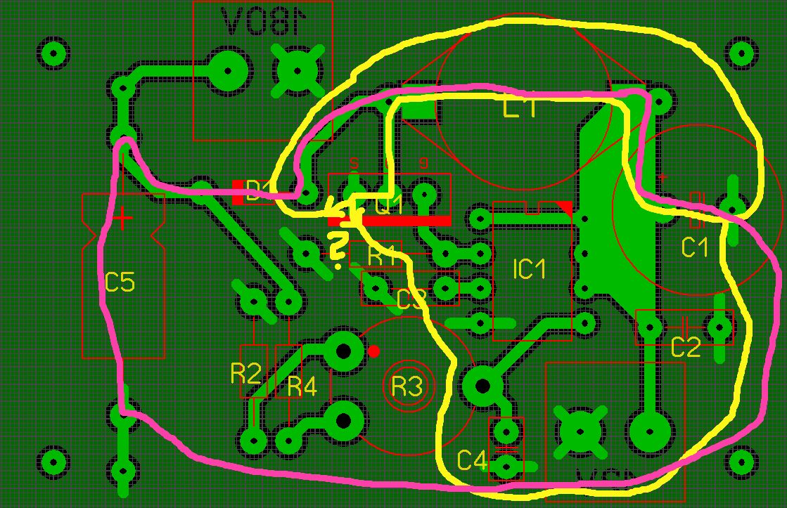 MaWin schrieb: > Daß Layout und Bauteilauswahl alles andere als gut sind Ich zeichne mal die bekannten Stromkreise ein: http://www.lothar-miller.de/s9y/categories/40-Layout-Schaltregler Fazit: Schlimmer geht nimmer. Einen weiteren Weg (insbesondere im Freilauf, rot) kann der Strom eigentlich nicht mehr nehmen müssen... Dass das schon im Schaltplan so übel aussieht, zeugt nur davon, dass der Sinn der Eingangskondensatoren (links) nicht so richtig verstanden wurde...