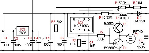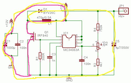 So, ich habe jetzt mal mit dem MC34063 ohne externe Transistoren einen DC-DC Wandler aufgebaut der aus 5V -> 170V erzeugt. Gedacht ist diese Platine für eine Single-Tube-Nixie-Uhr. Die Platine ist noch nicht ganz auf Durchmesser beschnitten. Das mache ich erst wenn die anderen Platinen fertig sind. Dem geübten Auge wird auffallen, das der Timing-Kondensator fehlt. Der MC34063 läuft mit ca. 80KHz wenn man diesen Kondensator weglässt. (Getestet mit 10 Exemplaren). Die Drossel ist selber gewickelt mit 14 Windungen 2 fach verzwirbeltem 0,3mm Draht für die erste Wicklung und mit 45 Windungen 0,3mm Draht für die 2. Wicklung. Der Kern kommt aus einer verstorbenen Energiesparlampe. D-aussen 10mm, D-innen 6mm, höhe 4mm, Al wert ca. 1200nH. Kein Bauteil auf der Platine erwärmt sich und die Schaltung liefert stabile 2mA bei 170V! Gruß, Andreas