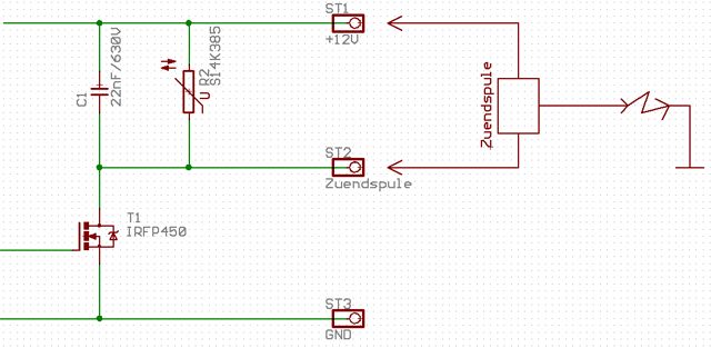 zum thema leistungsteil: ich benutze den irfp450 (zündspule an +12V, wird über irfp gegen masse gezogen) seit über 5 jahren bei einer elektronischen zündung für mein motorrad, dass was ich als wichtig erachte ist, dass die zündspule im abschaltmoment eine ausreichend hohe primär-rückwärts-spannung aufbauen kann, damit die sekundärspannung ebenfalls ordentlich hoch ist, für ein guten funken. wenn man nun eine freilaufdiode parallel zur zündspule einbaut, ist funke schlechter, als mit einer unterbrecher-zündung. deswegen nehme ich auch parallel zur zündspule ein 385V varistor, damit kann die im abschaltmoment ein ordentlichen funken erzeugen, mit hilfe der internen diode des irfp und die spannung ist trotzdem unterhalb der maximalspannung des fet... (das prinzip ist bewährt, hab ich mir auch nur abgeguckt) LameM