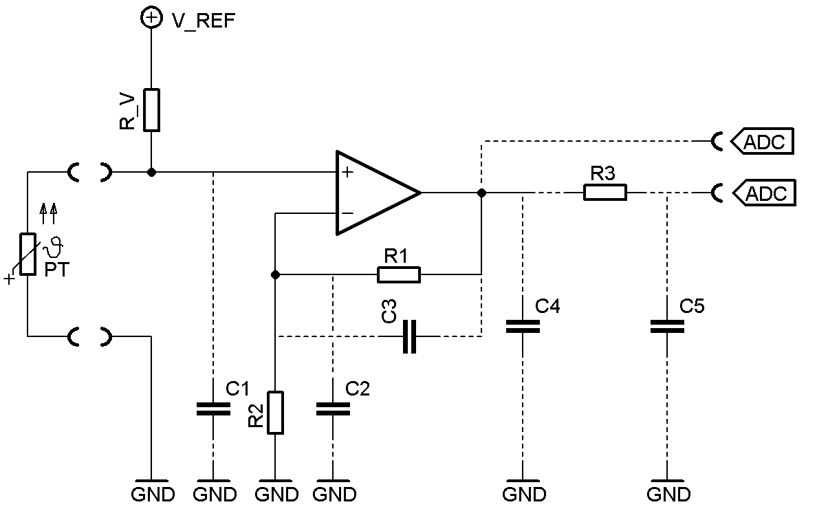 Guten Morgen, Benedikt, für eine Temperaturmessung würde ich getrost alles weglassen ;-) Du hast es hier nicht mit höheren Änderungsfrequenzen zu tun, Dein Sensor reagiert mit Sicherheit aus OP-Sicht träge. M.E. nach bringt Dir keiner der hier eingezeichneten Kondesatoren einen Vorteil. Du schreibst: > ...Nach Möglichkeit möchte ich natürlich einen "ruhigen" Messwert haben, > der nicht in seiner letzten Stelle immer hin und her hüpft, wenn man das > ganze anguckt. Wenn ich richtig sehe gehst Du auf einen A/D-Wandler, da kommts doch viel mehr auf den A/D-Wandler und Deine Software an, ob die letzte Stelle "hüpft" wie Du es nennst. Ein A/D-Wandler ab geschätzten 8Bit aufwärts wird Dir fast sicher immer in den letzten Bits wackeln, was normal ist. Die Empfindlichkeit ist da einfach zu hoch. Daher liegts ja an Dir zum Beispiel eine Mittelwertbildung über eine gewisse Zeit / Anzahl Messwerte zu machen oder eben Deine letzte Stelle per Software etwas zu "beruhigen". Viel Aufwand für den analogen Teil lohnt hier nicht, alles was Du brauchst kannst Du digital in Deiner Software viel besser erledigen! Grüsse Michael