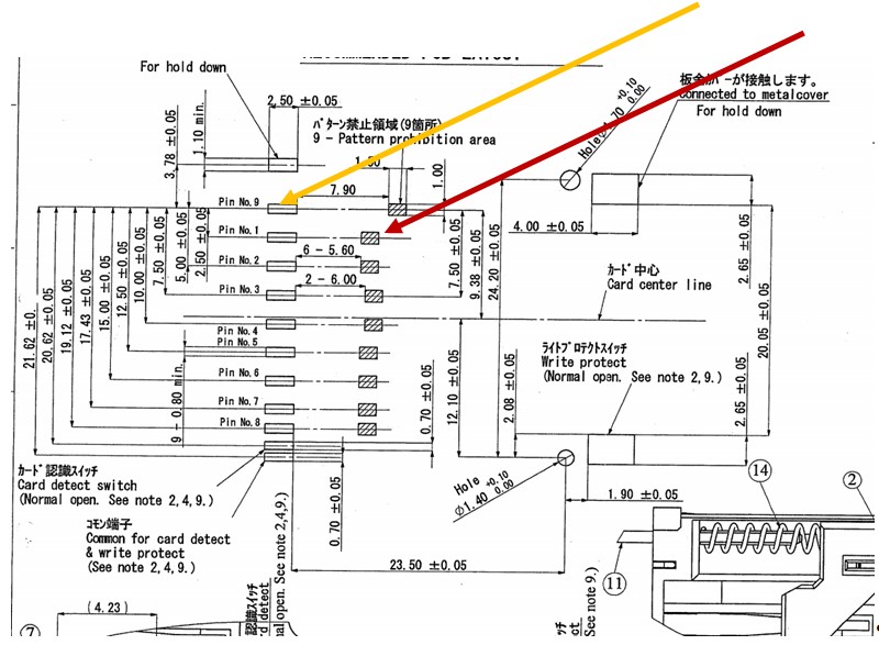 Hallo Wollte grade den Footprint einer SD Karte zeichnen. Nun bin ich grade etwas unsicher. Welches sind die Anschluss der Pads im angehängten Bild? Da wo der rote oder der gelbe Pfeil hinzeigt? Danke für die Hilfe. Hier der Link zum ganzen DB https://www.distrelec.de/sd-card-sockel/yamaichi-electronics/fps-009-2405-0/650223 Gruss und danke