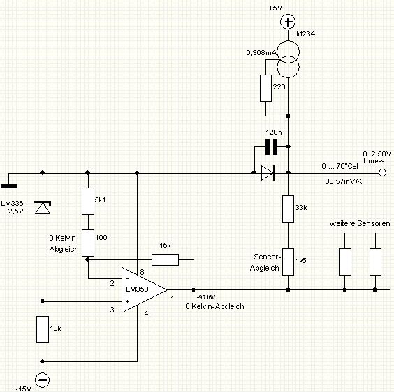 gut ok und wie sieht es mit dem Sensor von Innovatek: aus ? Er hat ja eine Tolleranz von ca 3,3 K , da dürfte eine Schaltung von 2 OPs ausreichen. Nur wegen der Konstantstromquelle mache ich mir gedanke, da ich für den Sensor sehr niedrige Ströme brauche, da der Sensorwiederstand bei 60 Grad C ca 3KOhm und bei 15Grad C 15KOhm beträgt. Bei 15KOhm und einem Strom von 5mA habe ich eine Spannugn von 75V !!! Als Konstantstromquelle wollte ich einen LM317 nehmen, aber er hat ja ein min. Load Current 3.5 mA !!!