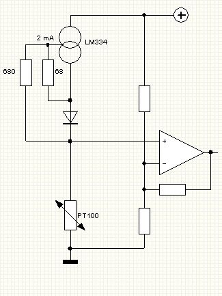 Ich habe vielleicht euer Problem noch nicht richtig erfasst. Ich hatte mal die Schaltung wie im Bild geplant. Stromquelle mit LM334 (Temperatur kompensiert mit Diode). Bereichsanpassung über Spannungsteiler an V+, beliebige Verstärkung. Ich wollte 10 Temperaturen mit AVR erfassen. Mit dem 10Bit-Wandler und 100° Messbereich kommen da 0,1° Auflösung raus. Mir waren dann die PT100 zu teuer und die 4-Drahtanschlüsse zu aufwendig und bei meinen langen Leitungen alles zu ungenau. Ich habe das ganze direkt mit den LM334 gelöst und bin immer noch begeistert: Beliebig lange Leitungen, seit Jahren stabil und besonders sehr sehr einfache Kalibrierung. Die Kalibrierung kann man bei einer beliebigen Temperatur machen, da der 2. Temperatur-Punkt der absolute Nullpunkt ist.
