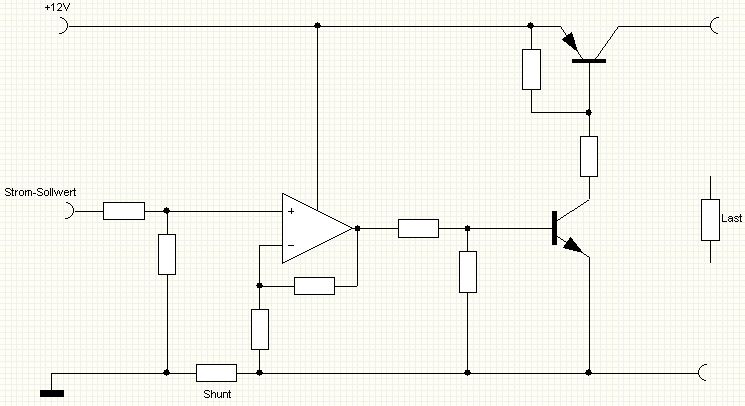 Ich bin nicht so richtig schlau geworden aus deinen Anforderungen. Ich glaube, du brauchst eine Spannungsregelung mit Strombegrenzung (Konstantstromquelle)? Was anderes macht der L200 auch nicht. Dabei möchtest du Den Strom vom µP vorgegeben? Mit dem L200 ist das schwierig, weil der Strom nicht in der GND-Leitung gemessen wird. Da könnte man einen Mosfet als geregelten Widerstand vorsehen. Aber der Aufwand ist größer, als gleich eine eigene Lösung. Ich würde eine diskrete Stromregelung einsetzten. Wenn ich mit deinen Anforderungen richtig liege, könnte die mitgelieferte Prinzipschaltung vielleicht helfen: Beide Transistoren werden durchgesteuert, solange der am Shunt gemessene Strom nicht erreicht ist. Der Sollwert vom µP wird heruntergeteilt auf den Wert, der am Shunt erreicht werden soll. Mit wenigen weiteren Bauteilen kann eine Spannungsregelung ergänzt werden.