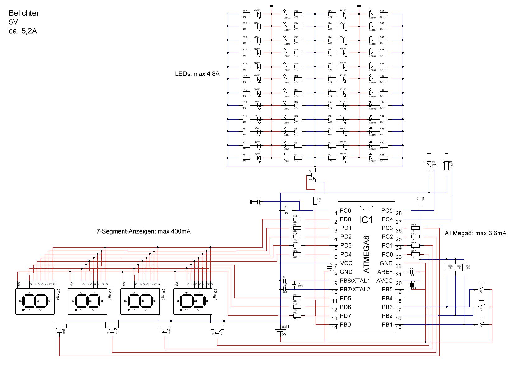 > Die Transistoren bei den 7-Segment-Anzeigen sind nicht gemeint. Die hättest du aber lieber auch ausrechnen sollen, dann wären EINIGE Fehler aufgefallen. Ein Port-Pin liefert laut datenblatt nur 20mA, und wird irgendwo zwischen 20mA und 40mA abregeln, du kannst dich also nicht auf mehr als 20mA verlassen. Deine 240mA kommen also nie aus dem AVR, auch nicht mit den (richtig berechneten) Vorwiderstand. > Das habe ich von hier übernommen. Leider wird hier viel Schrott von ebenfalls Unwissenden geschrieben. 20mA pro Portpin erlauben nur 5mA (im Mittel, entsprechen also dem Helligkeitseindruck von 5mA Dauerstrom) pro LED und 160mA pro Transistor, der seiterseits 16 ( oder 8) mA aus dem Portpin braucht. > Als Einschaltstoßstrom ist 36A angegeben Das Schaltnetzteil zieht den Strom beim Einschalten aus dem Netz. LEDs haben (im Gegensatz zu Glühbirnen) keinen Einschaltstromstoss. Schaltet man die LEDs in Reihe an eine wesentlich höhere Spannung, braucht man weniger Vorwiderstände und muss einen geringeren Strom schalten. Allerdings sollte man dann Masse schalten mit einem NPN (oder NMOSFET).