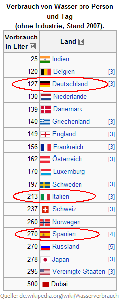 Wasserverbrauch pro Person und Tag: 127 Deutschland 140 Griechenland 213 Italien 270 Spanien 295 USA http://de.wikipedia.org/wiki/Wasserverbrauch
