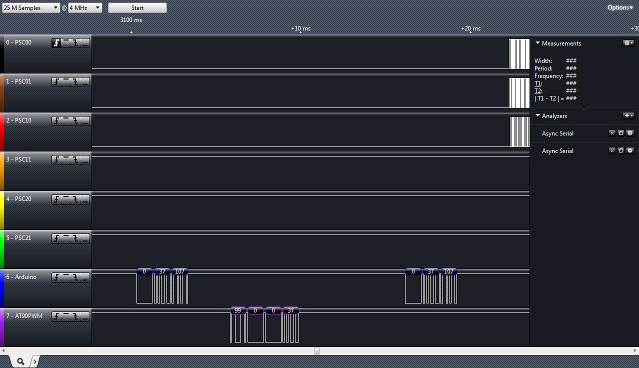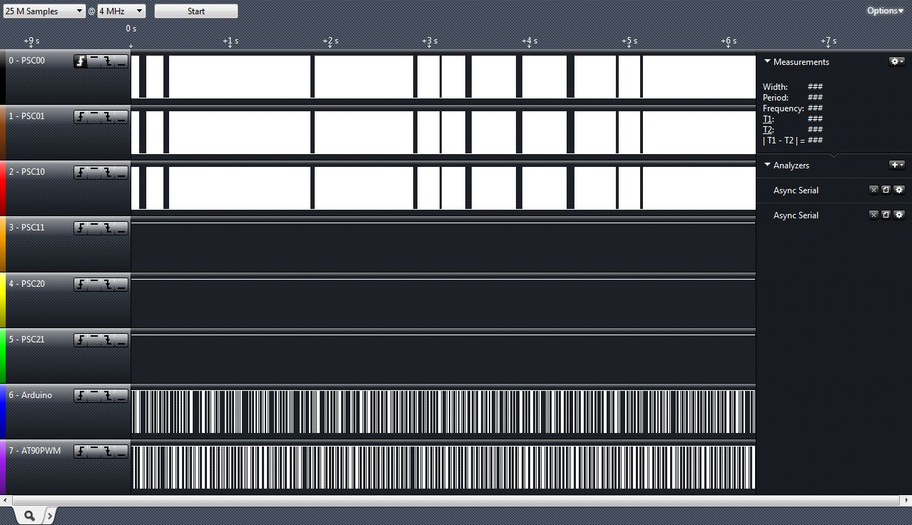 Die oberen 3 Zeilen sind das PWM-signal, mit Aussetzern wenn der