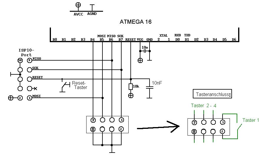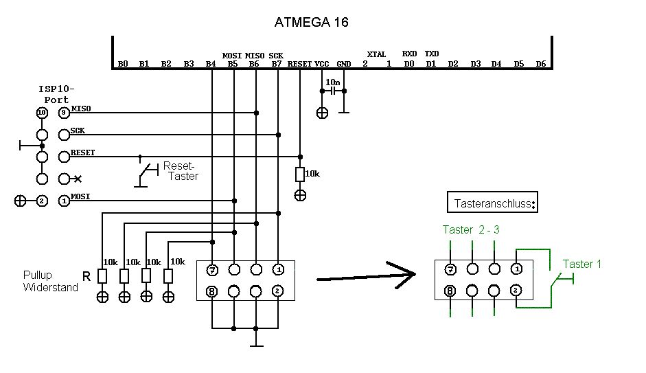 Zuerst einmal Danke für die schnellen Antworten! Allerdings sind dann noch ein paar Fragen aufgetreten: (Die Schaltskizze habe ich angehängt!) o Stimmen die Pulldown Widerstände, oder sollten es Pullup Widerstände Sein? Oder soll ich die Taster direkt an +5V / Masse hängen?? Beziehungsweis: Stören die PULLUP / PULLDOWN Widerstände durch den vordefinierten Wert das Programmieren des Controllers?! o Passt die Reset-Beschaltung? o Wenn die Taster prellen, kann ich da einen Kondensator hinzugeben, wenn ja, wo? (Stört dieser dann das Programmieren? / Wie groß müsste dieser dann sein?) o Ist sonst noch ein Fehler drin? o Der ATMEGA16 hat ja einen interen Taktgeber, dann brauche ich ja keinen externen Quarz anschließen??!! Oder ist es besser, wenn man einen externen Quarz anschließt? mfg Gregor
