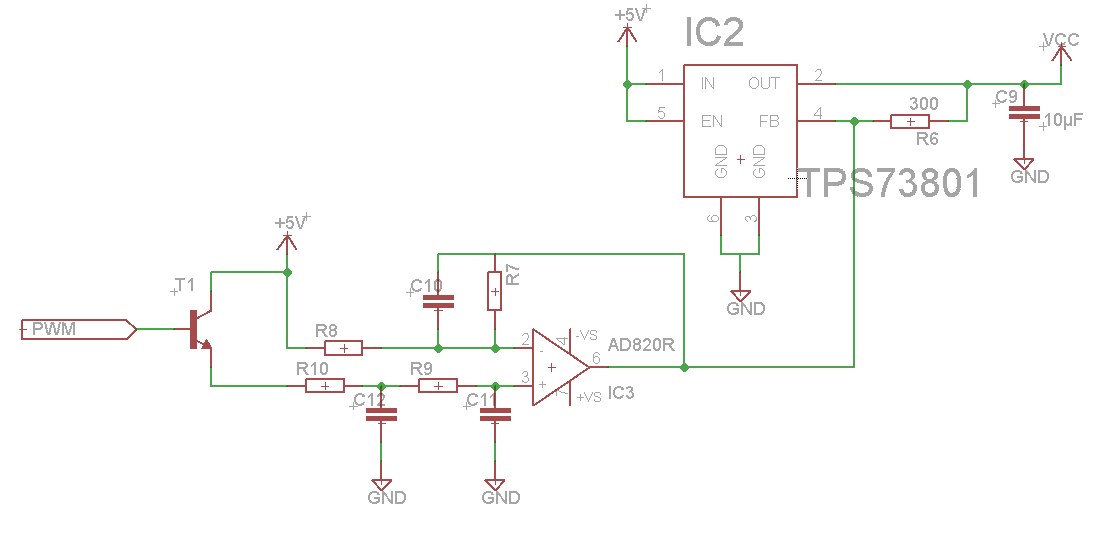 Danke für die schnelle Antwort! Das hört sich ja schon mal gut an, im Bezug auf den Spannungswechsel am µC. Ich entwerfe ein Board, zum Testen eines selbst erstellten µC (DUT, aus einem Praktikum an der Uni). Das Board soll eine Art STK500 sein, ein DUT (Device under test) und ein µC (ATmega) zum steuern/auswerten. Dabei soll alles zwischen 3,3V und 5V laufen können. Dabei kam mir halt die Idee per PWM ein LDO zu steuern, so dass ich ohne Pegelwandler auskomme. Vielleicht habt ihr noch besser Ideen zu dem Thema. @Flak: Was ist an der Schaltung so fehlerhaft?