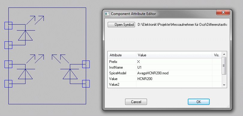 Oh, das .mod hatt ich nur kurz eingefügt zum testen. Das stand die ganze Zeit "AvagoHCNR200" drin. Ich habe jetzt "CNR200" eingetragen und Value leer gemacht. Jetzt kommt eine jedoch andere Fehlermeldung. Can't find Definition of Model "TEST". Ich kann mich nicht erinnern irgendwo "TEST" eingetrgaen zu haben.