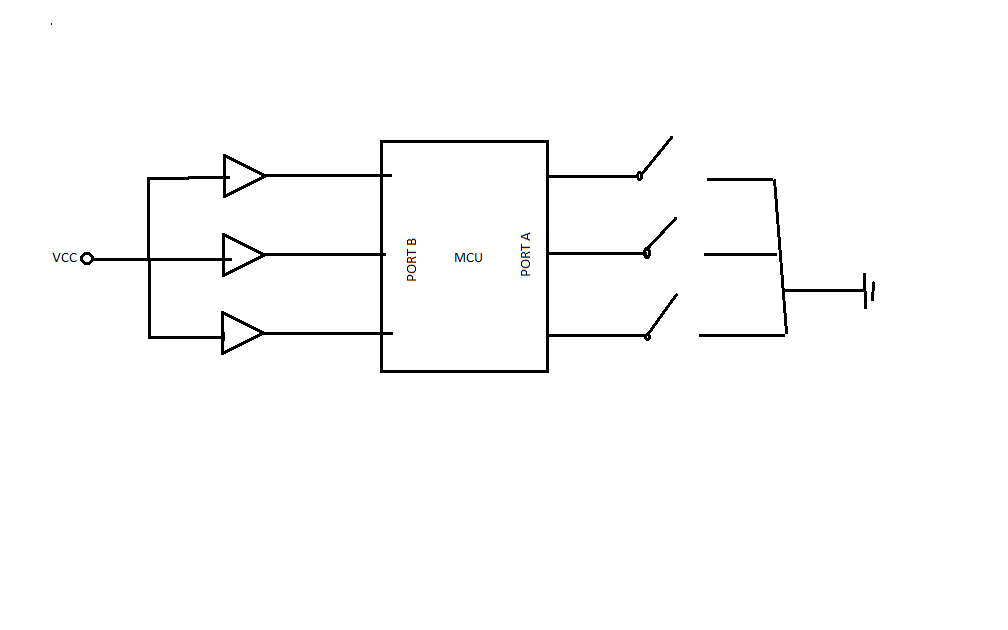 Hallo! Betrachtet bitte meine grandiose Zeichnung :) Zwei Ports mit jeweils 3 Pins. Port B hat Ausgangs-, Port A Eingangspins. Pullup Widerstände sind an. Wenn jetzt ein Schalter offen ist, wieso liegt dann am PIN von Port A eine 1 an?