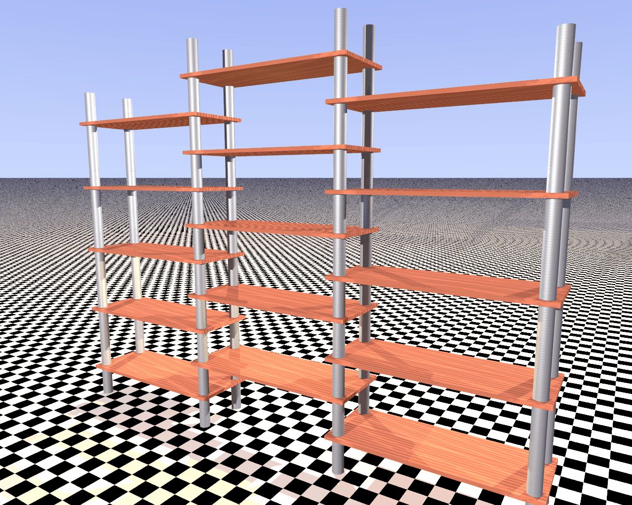 Hallo zusammen, ich hoffe doch man kann mir hier etwas weiterhelfen. Wie im Anhang, dank Pov-Ray, zu sehen ist spiele ich mit dem Gedanken mir ein solches Regal selber zu bauen. Das Problem ist allerdings, dass ich bisher keine Lieferquelle für die Zylinderstücke finden konnte (mit oder ohne Innengewinde). Da diese doch recht häufig verwendet werden dachte ich es sei kein Problem so etwas zu organisieren. Günstig sollte es auch sein, zumal viele Einzelstücke davon benötigt werden. Notfalls schneide ich mir die Längen halt selber zurecht. Regalmaße: 2,80 x 2,20 x 0,35 m³
