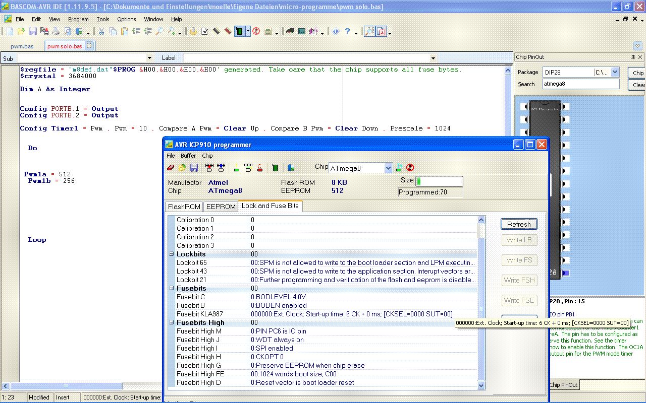 Hallo, die Überschrift sagt eigentlich schon fast alles. Ich möchte auf meinem myAVR Board einen ATMEGA 8 programmieren. Dazu habe ich mir die Demo von Bascom runtergeladen. Probleme macht mir dabei das setzen der Fusebit´s. Immer wenn ich das „Fusebit KLA987“ auf „111110:Ext.Crystal/Resonator ….“ setze und dann „WriteFS“ drücke wechselt das Fusebit wieder auf „000000:Ext.Clock…..“ also auf den ersten Eintrag der Auswahlzeilen. Wie kann ich denn nun testen, ob der Befehl ausgeführt wurde oder ob der ATMEGA8 immer noch auf 1MHz intern läuft( statt auf 3864000Hz extern wie er sollte). Ich habe es zumindest mal mit einer PWM probiert (den Prescale mit 1024, Timerauflösung 10bit, compare 512). Dabei sollte die LED laut Rechnung mit 1,7Hz blinken, wenn ein Takt von 3864000Hz zugrunde liegt. Die LED blinkt jedoch mit ca 1s Takt. So sollte doch zumindest beim umstellen des Fusebit´s von 1MHz intern auf 3864000Hz extern, ein deutlicher unterschied der Blinkfrequenz erkennbar sein. mfg steven