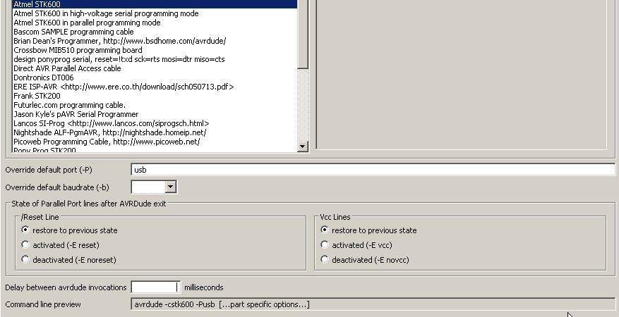 Hallo zusammen, ich versuche mittels Eclypse mein STK600 zu flashen. Mittels AVR studio klappt das ganze. Allerdings bekomme ich mittels Eclypse die Fehlermeldung des AVRDude's: "Could not open teh USB device with the port name "usb". Please check that ..... Reason avrdude: usbdev_open(): did not find any USB device "usb" " Unter Eclyse benutze ich die im Bild mitgelieferten Einstellungen. Meine Eclypse Version ist: Eclipse IDE for C/C++ Developers Version: Helios Service Release 2 Mein AVR Eclipse Plugin ist: avreclipse-p2-repository-2.3.4.2010 Meine AVRdude Version ist 5.10 Meine Idee ist das ich den USB Port anders angeben muss aber ich habe sehr viele Forumsbeiträge hier durch als auch bei google gesucht und habe leider keine Hilfestellung finden können. Hat irgendjemand ne Idee was man ändern muss ? Bin für jede Hilfe dankbar. Grüße Alex PS. Entschuldige für den doppelpost des Bildes. Kann leider keines entfernen
