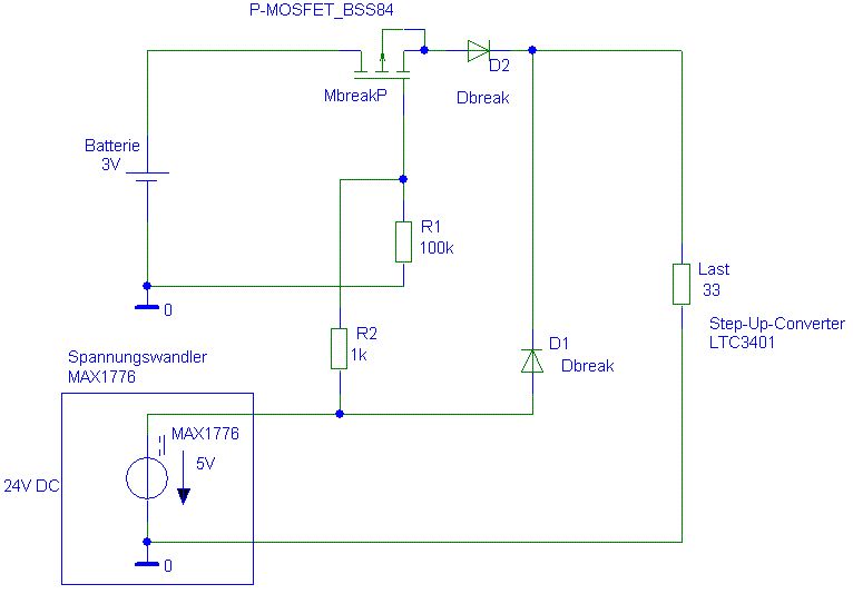 Hallo! Ich entwickle einen Controller für ein Sensorsystem und versuche gerade folgendes Problem zu lösen: Ich habe eine externe Spannungsversorgung von 24V (DC), die aber nur zeitweise zur Verfügung steht. Die Zeiten ohne diese Versorgung will ich mit einer Batterie überbrücken. Die vorläufig ausgesuchte Batterie hat 3V. Damit will ich drei Sensoren und einen Mikrocontroller (Atmega16) versorgen, die jeweils 5V benötigen und insgesamt bis zu ca. 125mA schlucken. Da ich nicht kontrollieren kann, wann die externe Spannungsversorgung ein- bzw. ausgeschaltet ist, brauch ich eine Schaltung, die automatisch umschaltet. Dazu habe ich mir beigefügte Schaltung überlegt, in der ich einen P-Kanal-MOSFET dazu nutze. Aus den 24 V mache ich mit einem Spannungswandler VOR dem MOSFET (und vor der Diode) 5V. Dann habe ich nach der Diode leider keine 5V mehr. In der Simulation sind es 4,2 V; die Sensoren laufen erst ab 4,75V. Deshalb will ich nach dem Umschaltsystem einen Step-Up-Converter schalten (an der Stelle an der im Schaltbild der Widerstand "Last" eingezeichnet ist) und daran meine Sensoren und den Controller hängen. Kann man das so machen? Eine Simulation hat außerdem gezeigt, dass von den 3V aus der Batterie nach dem Umschaltsystem 1,5V angekommen (wenn die andere Spannungsquelle abgeschaltet ist). Das würde für den Step-Up-Converter (ein LTC3401) immer noch ausreichen. In einem nächsten Schritt soll auch noch eine SD-Karte versorgt werden. Diese benötigt 3,3V. Meine Überlegung: Parallel zu dem einen noch einen zweiten Step-Up-Converter (ebenfalls LTC3401) schalten und auf 3,3V Ausgangsspannung einstellen. Dann kann ich sogar den Mikrocontroller mit 3,3V statt 5V betreiben, um Strom zu sparen. Ist das eine gute Idee oder könnte das zu unerwünschten Effekten führen? Kann mir dazu jemand eine qualifizierte Einschätzung geben? Freundliche Grüße, Andrea