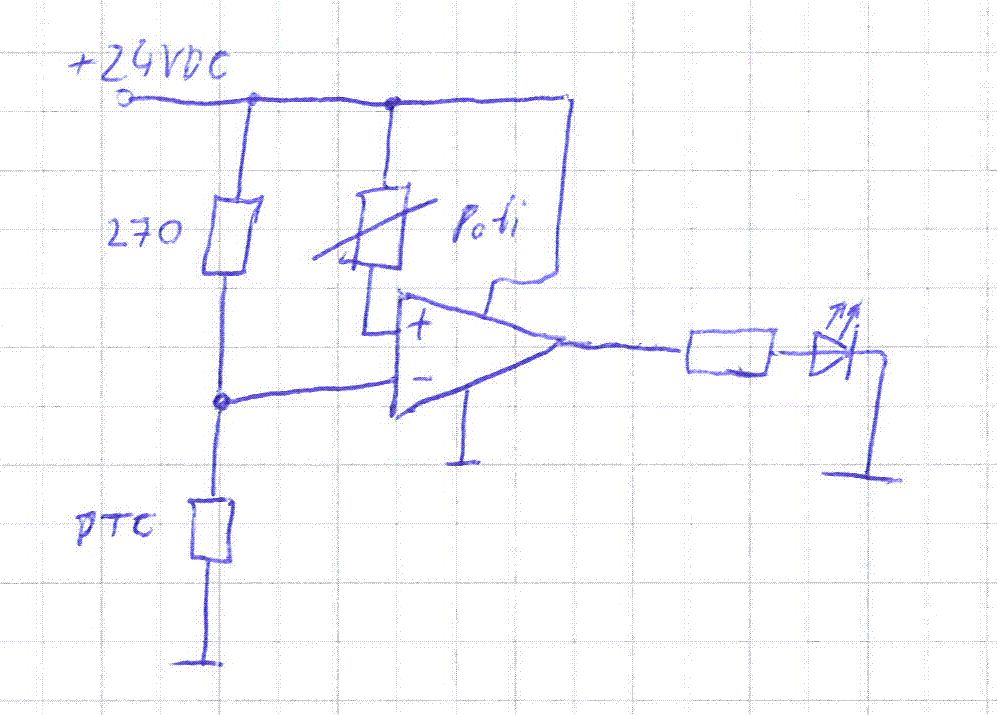 Danke für die Schaltung mit dem TCA965, aber der ist mittlerweile schwer zu bekommen und die Schaltungsdimensionierung wtwas aufwändig. Zum zweiten Vorschlag mit Komparator hab ich mir folgende Schaltung überlegt: siehe Anhang; Das Poti soll dazu dienen, die Ud (Differenzspannung) anpassen zu können. Bei einem 270 Ohm Vorwiderstand hab ich am PTC trocken 20,5V 12,5mA und nass 4,4V 73mA gemessen. Als OPV hätt ich einen LM393 genommen. -> funktioniert das so einfach?