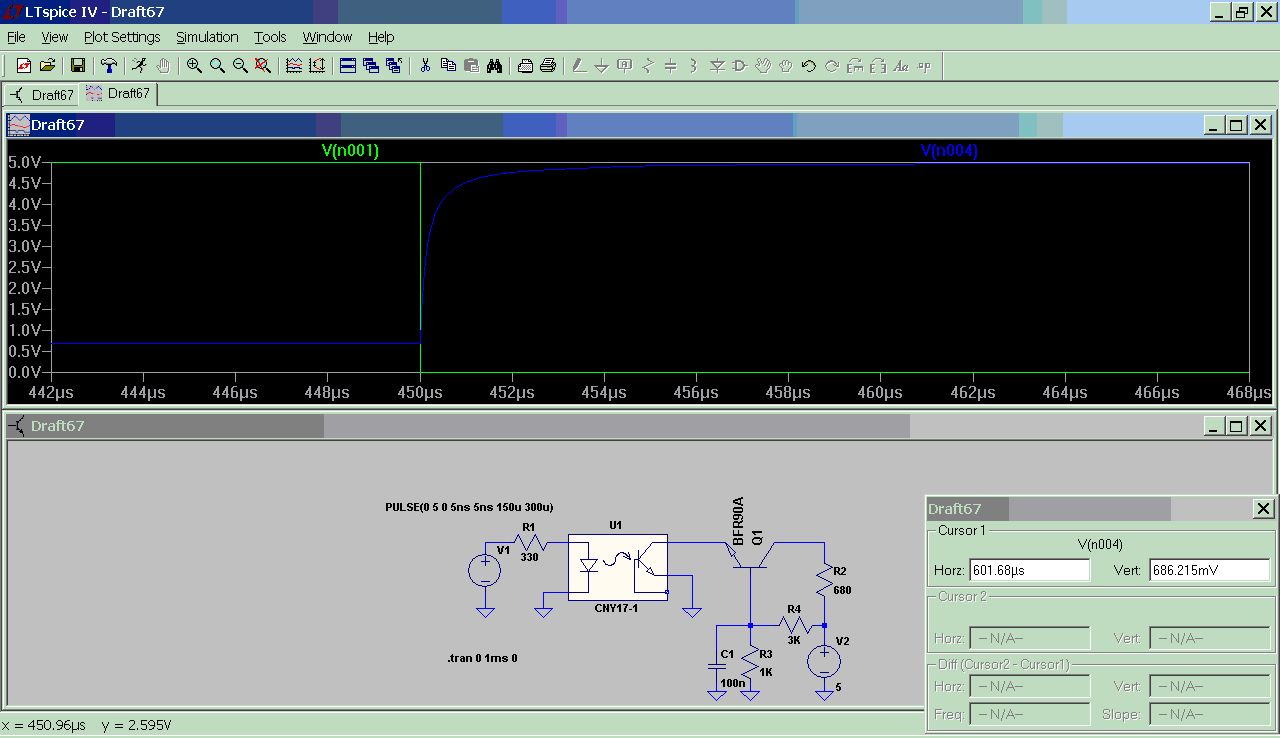 Servus, ich würde diese ganzen LT-Spice-Spielereien mit Vorsicht genießen, d.h. erstmal davon ausgehen, daß die tollen Werte im realen Leben so nicht erreichbar sind! Nach meinen Tests gibt es bei den LT-Spice Optokopplern, ganz im Gegensatz zu dem realen Modellen, offenbar gar keine Sättigungseffekte des Transistors. Nimmt man z.B. eine Standard-Schaltung, z.B. 4N26, E an Masse, C über 1k an +5V, beginnt die Spannung am Kollektor unmittelbar nach dem Abschalten des LED-Stroms zu steigen! Der echte 4N26 braucht da etliche Mikrosekunden, bis der Transistor aus der Sättigung kommt...