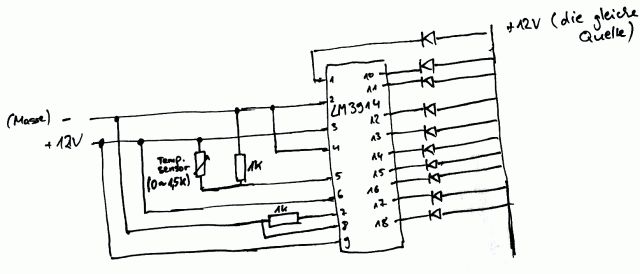 > Sobald ich den Sensor einbaue, hat er Massekontakt und nichts geht mehr. Tja, Sensor mit isolierten Anschlüssen nehmen. > Daran hab ich nicht gedacht, aber wie schließe ich sonst einen > Widerstand an, der eine Kontakt auf Masse hat? Ein Widerstand der bei steigender Temperatur seinen Widerstandswert senkt und zu einer steigenden Anzeige führen soll, hättest du noch dazusagen müssen. Ist bei dem Chip schwer. Wenn du deinen neuesten Schaltplan nimmt, und an Stelle des Sensors dort wirklich ein 1k Poti einbaust, und den Sensor statt dem 6,25k Widerstand einbaust, dann bekommst du zwar ein steigendes LED-Band bei sinkendem Widerstand wegen steigender Temperatur, aber nicht mit den gewünschten Skaleneintelung. Ich habe Zweifel, daß sich die gewünschte Skaleneinteilung einstellen lässt, in dem man am Poti dreht und dem Sensor weitere Festwiderstände parallel und in Reihe schaltet, aber du kannst es ja mal ausprobieren (oder ausrechnen, im Datenblatt des LM3914 stehen eigentlich alle Formeln, der Sensor an Position des 6.25k wird sogar von 1mA Konstantstrom durchflossen)