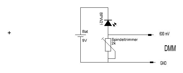 Danke für die Hilfe.... ich habe eben mal die Schaltung von Stefan mit dem 2k Widerstand aufgbaut und hab da ein paar Verständnisfragen: Der Wert den ich über das Multimeter abnehme liegt jetzt lichtabhängig zwischen 0 und 25 mV bei bewölkten Himmel. Allerdings macht es wertetechnisch keinen unterschied ob ich die externe Spannungsquelle angeschaltet habe oder nicht. Ist das normal oder habe ich da etwas falsch gebaut? entschuldigt bitte diese doofen Fragen, aber ich steh da gewaltig auf dem Schlauch und komme nicht vorwärts =(
