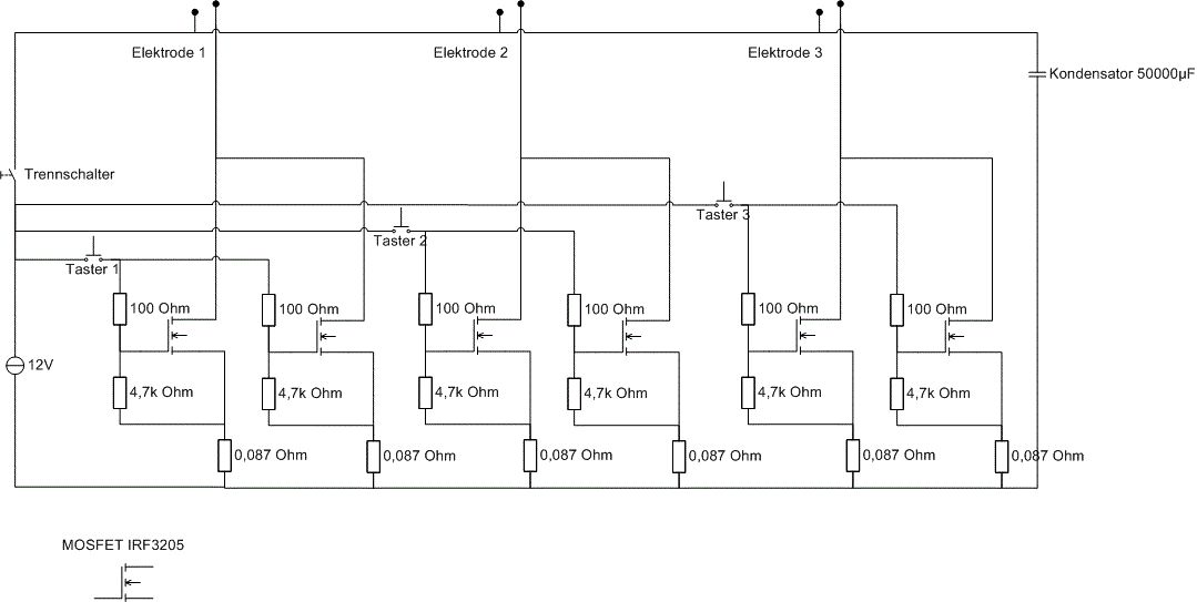 Hallo, ich arbeite zurzeit an meiner Diplomarbeit im Bereich Maschinenbau bei der ich im praktischen Teil dünne Stahlbleche (ja 50µm) mit dem Kondensatorentladungsschweißverfahren im Überlappstoß verbinden möchte. Dazu habe ich mir schon einen einfachen Aufbau zusammengebaut mit dem das Schweißen einzelner Punkte gut funktioniert. Allerdings fehlt mir ein wenig der elektrotechnische Sachverstand bei manchen Details und hoffe, dass ihr mir helfen könnt. Um eine bessere Reproduzierbarkeit zu erreichen und die ganze Handhabung einfacher zu gestalten, möchte ich jetzt eine Schaltung bauen, bei der die drei Elektrodenpaare nacheinander in einer beliebigen Reihenfolge geschaltet werden können. Genauer gesagt sollen es drei veränderbare Kondensatorpakete geben, die über eine Stromquelle geladen und jeweils per Knopfdruck einzeln entladen werden können. Die Eingangsdaten sind: • Laden bei einer Spannung von 12V und 16V (momentan über einen 100Ω Widerstand) • Kondensatorkapazität veränderbar zwischen 22.000µF und 62.000µF (in 10.000µF Schritten) Ich habe jetzt im Netz eine Schaltung gefunden, die grundsätzlich dem entspricht was ich bauen möchte (siehe Dateianhang). Allerdings werde ich nur den türkisfarbenden Teil einsetzen. Nun zu meinen Fragen. Im türkisfarbenden Bereich sind MOSFETs eingesetzt, die nach meiner Recherche pro Stück ca. 14Euro kosten. Besteht die Möglichkeit mehrere „kleinere“ MOSFETs parallel zu schalten, um nicht die teuren MOSFETs nutzen zu müssen? Ich habe mir auch sagen lassen, dass die Kondensatoren am besten über einen Widerstand entladen werden sollte (Haltbarkeit). Wie kann ich sowas auslegen oder könnt ihr mir über die Eingangsdaten einen Daumenwert nennen? Über eine kurze Rückmeldung würde ich mich freuen. Falls ihr noch mehr Details braucht steh ich euch gerne zu Verfügung. Besten Dank schon mal! Gruß Robert