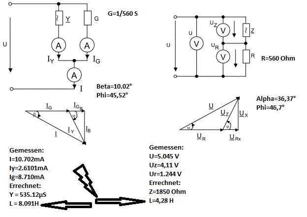 Richtig, bei den Impedanzen ist es eine Reihenschaltung R+jX und bei den Admittanzen eine Parallelschaltung. 3-Spannungsmesser Z=1850 Ohm/46.7 Grad = R+j*omega*L -> L=4.29H 3-Strommesser Y=535.12e-6 S/-45,52 Grad = 1/Z = 1/(1868.72 Ohm/ 45.52 Grad) -> L=1868,74*sin(45.52)/(2*pi*50)H= 4.24 H ... kaum 10 Jahre später ...