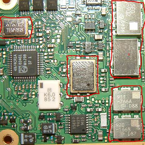 Hallo, mir ist ein Handy Ericsson S868 in die Hände gefallen und nun möchte ich gern mehr über die rot gerahmten Bauelemente wissen. Eine Suche nach den Bezeichnungen half mir nicht weiter und ich weiß auch nicht recht, was die sind. VCOs, Filter? Die 2 oben rechts haben folgende Beschriftung: der obere: 5E0 -902 Muratalogo D836 der untere 524 -1747 Muratalogo D87 Sven
