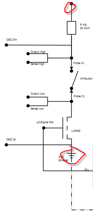 Moin nochmal, anbei jetzt das Schaltbild. Wir wollen HF-Schalter testen. Das Signal soll dann zwischen den markierten Anschluessen anliegen. Vielen Dank für Eure Hilfe