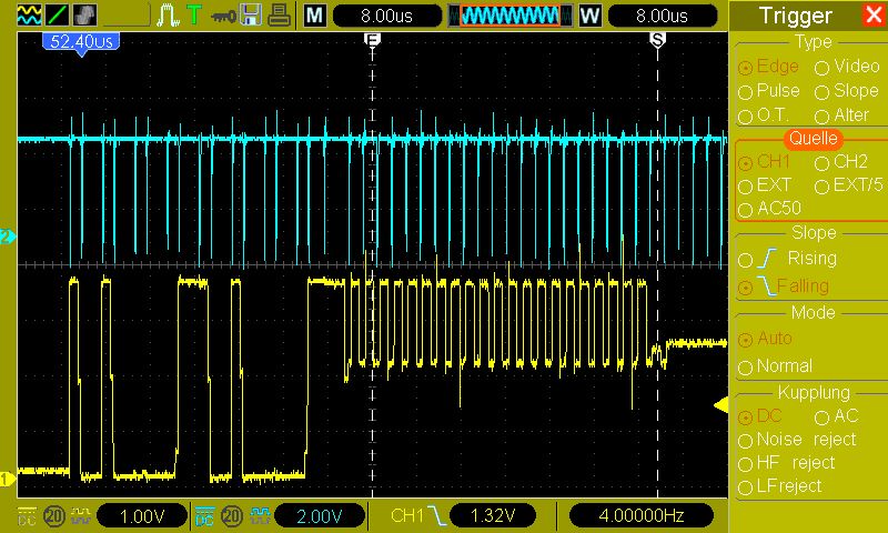 Magnus Müller schrieb: > Miss doch mal zeitgleich die LCD_WR Leitung. Es sieht so aus als würden > der AVR und das Display gleichzeitig Daten auf den Bus legen. Habe ich gemacht... Siehe Bilder im Anhang (Blau ist WR) Ich habe übrigens herausgefunden, dass das Signal mit jenem der CS Leitung übereinstimmt. wenn ich das CS Signal entferne, dann geht die Gelbe leitung auf High anstatt bei VCC 1/2 zu hängen und einen clock zu haben. Wegstaben Verbuchsler schrieb: > WireWrap wird es sicherlich nicht sein, eher Fädeldraht. Es ist nich WireWrap technik aber ich verwende WireWrap draht. Also AWG28