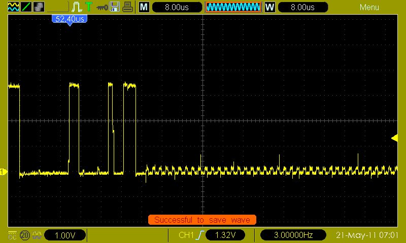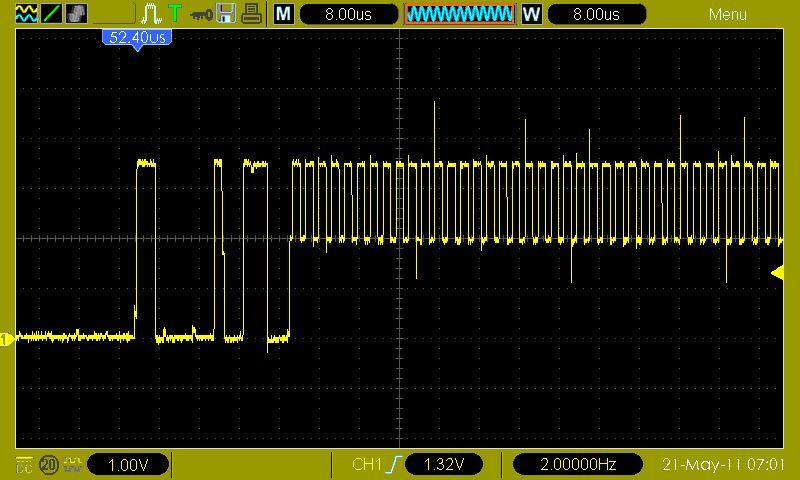 Magnus Müller schrieb: > Äääh... Quatsch! Ich meinte die LCD_RD Leitung.... Habe ich nun gemacht und im Anhang das Bild... (blau ist die RD Leitung... Code ist derselbe! ) A. K. schrieb: > Besser: Erst die DATAx auf 0xFF setzen, dann als Ausgang definieren. Was genau meinst du damit? Soll ich bevor ich auf Ausgang schalte PORTB = 0xFF machen? A. K. schrieb: > PS, hat nichts mit dem Problem zu tun: Auch empfehlenswert, wenn im LCD > nicht sowieso drin: Ein schwacher externer Pullup-Widerstand an CS Werde ich mir merken... Danke :)
