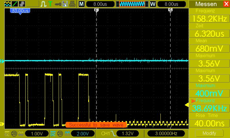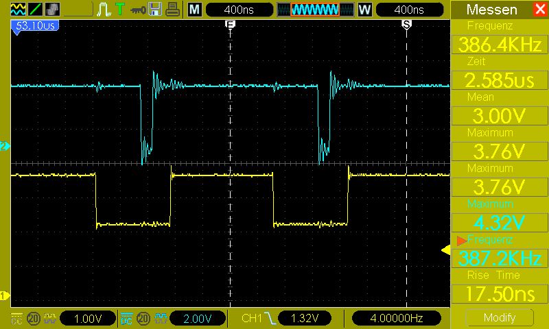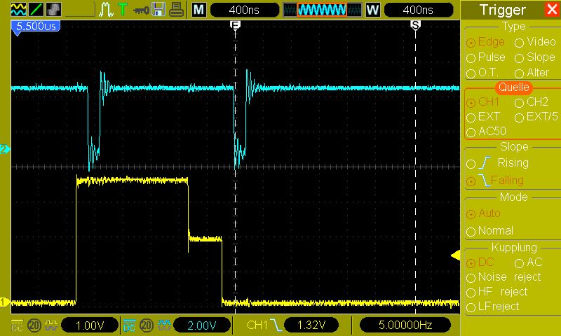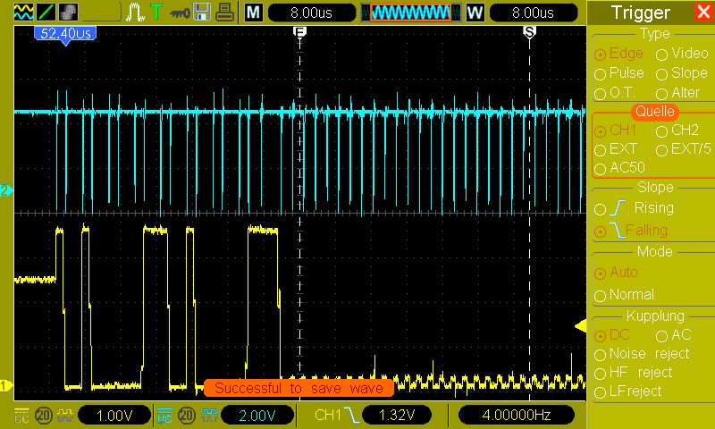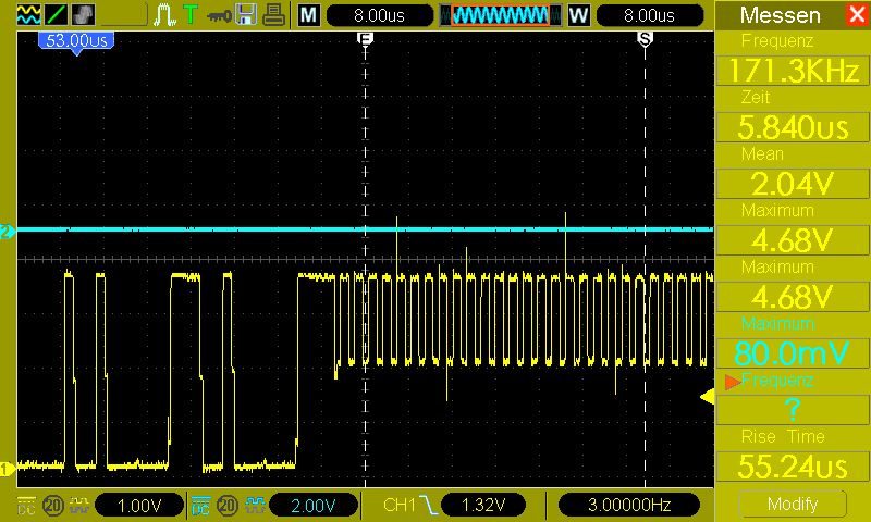 Guten Morgen Ich habe dieses Display hier gekauft: http://cgi.ebay.ch/ws/eBayISAPI.dll?ViewItem&item=280575347222&ssPageName=ADME:B:EOIBSA:CH:1123 Hier Datenblätter etc... http://www.bestelecs.com/download/lcd_pcb_module/3inch2_tft.zip Nun habe ich den Angehängten Beispielcode angepasst auf einen Atmega16 mit 3.3V und 12MHz Meine Hardware: Atmega16@12MHz PortA: DB0..DB7 des Displays PortC: DB8..DB15 des Displays PortB: Steuerleitungen Der Atmega läuft selbst auch mit 3.3V. Aufgebaut ist alles auf einem Stück lochraster mit WireWrap drähten auf der Rückseite... also relativ schlechte EMV verdrahtung... Jedoch über der Speisung des 3.3V Reglers ein 22uF Tantal + 100nF keramik. Speisung des Atmega auch 100nF keramik und direkt bei der Display Speisung 100uF + 100nF Keramik. Nun zum problem... Das Display tut nichts! Die verbindungen stimmetn 100% habe ich 5 mal kontrolliert... auch mit dem LA geprüft... Doch nun habe ich mit dem Oszilloskop mal die Datenleitungen DB0..DB7 (auf dem bild ist jedoch nur eine Leitung) angeschaut. Dabei ist mir aufgefallen das es sehr merkwürdige signale sind. (Siehe bilder im anhang) Wie kommen diese zu stande? besonders Bild1 was könnte ich hier als abhilfe tun? Danke schonmal