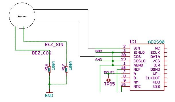 Hallo zusammen, kennt sich einer von euch mit Resolvern aus? Ich bräuchte Hilfe beim Anschließen eines Resolvers. Mein Problem liegt im Anschluss der Massen, der einzelnen Resolverwicklungen. Im Datenblatt meines Auswertebausteine (AD2S90) werden alle Bezugspotentiale auf Masse gelegt. Siehe Anhang Seite 5. In einer Schaltung habe ich allerdings gesehen, dass die Bezüge für die Ausgangssignale mit einem 100 Ohm Widerstand gegen Masse gelegt werden. Die Eingange SINLO und COSLO des AD2S90 sind direkt mit Masse verbunden. Siehe Schaltplan. Das Datenblatt des Resolvers (Tamagawa) verstehe ich so, dass die Signale differenziell gemessen werden sollen. Was ist nun richtig??? 1. Alles auf eine Masse? 2. Sekundärwicklung mit 100 Ohm gegen Masse, und Eingänge des AD2S90 auf Masse 3. Differenziell messen Vielen Dank für eure Hilfe. Gruß Benjamin
