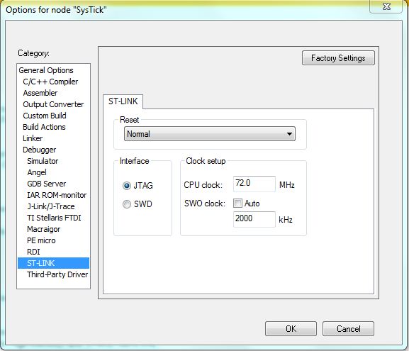 Sorry ich hab mich in letzter Zeit mit anderen Dingen beschäfigen müssen und hatte noch nicht viel Zeit weiter an dem Problem zu arbeiten. @Gebhard Raich: Die ISR Namen stimmen. >Und gab es Probleme mit der V2 ? Ja also, die Verwendung von V2 hat mit meiner Version von IAR nicht funktioniert, darum habe ich mir die neuste Version geholt. Damit habe ich auch das SysTick Bsp. zum laufen bekommen (funktioniert alles einwandfrei, auch die Interrupts). Nur wenn ich den Code erweitere ich also zum Bsp. ein printf für Debugausgaben oder andere größere Funktionen einfüge wird der Code zwar fehlerfrei compaliert, aber beim laden auf den Controller hängt sich der IAR dann immer auf! Wenn ich nur ein paar Codezeilen einfüge ist dies allerdinges kein Problem. Mit OpenOCD habe ich dieses Problem nicht, allerdings besteht hier weiter das Problem mit den Interrupts! @Turbo J: Danke für den Tipp. Ich kann es aber leider erst mitte nächster Woche ausprobieren. Ich meld mich aber dann sofort mit Ergebnissen. @alle: Hat jemand eine Idee was mit dem ST-Link/V2 schief laufen könnte? Die Version 2 muss doch eigentlich funktionieren oder kann es sein, dass irgendwelche Kompatibilitätsprobleme mit IAR EWA bestehen? Hier nochmal die Eckdaten: - ST-Link/V2 - Treiber von ST-Homepage heruntergeladen (für V2) - IAR EWA Verson 6.2 - Einstellungen ST-Link siehe Anhang Habe auch andere Einstellungen (Reset Pin und Connect during reset)versucht, ohne Erfolg. - STM32-LCD Board von Olimex mit STM32-F103ZE Für weitere Tipp und Anmerkungen wäre ich dankbar!