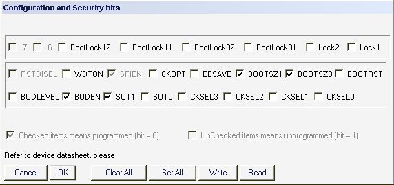 Wie in dem Screenshot oben. 1) Ich persönlich würde den Brounoutlevel auf 4.0V setzen (Häkchen bei BODLEVEL) und die Startuptime auf 64ms statt 0ms (Häkchen bei SUT1 weg). 2) Bevor ich die Fuses schreibe, würde ich die Fuses auslesen und mit dem Datenblatt kontrollieren. Nur wenn die Fuses richtig gelesen wurden, würde ich einen Schreibversuch wagen.